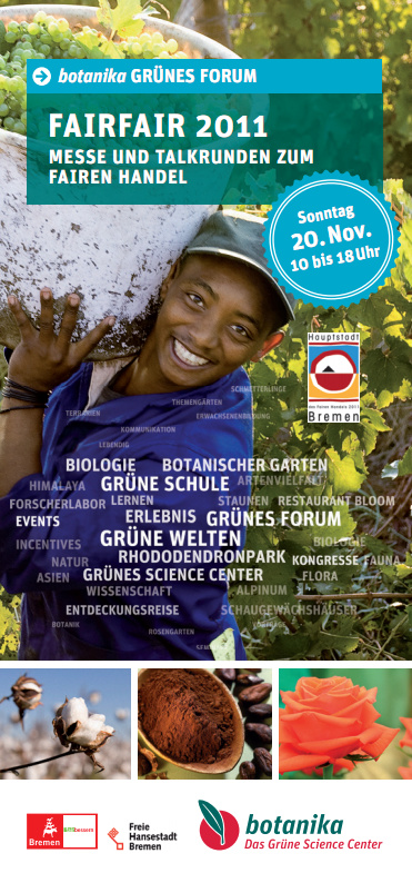 In Bremen gibt es zum ersten Mal die eintägige FairFair. Ich glaube, es ist sogar die erste Fair-Trade-Messe in Bremen überhaupt! Sie findet statt am 20.11. von 10-18 Uhr in der Botanika.