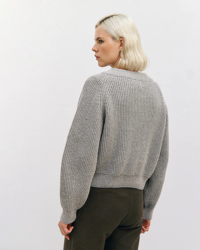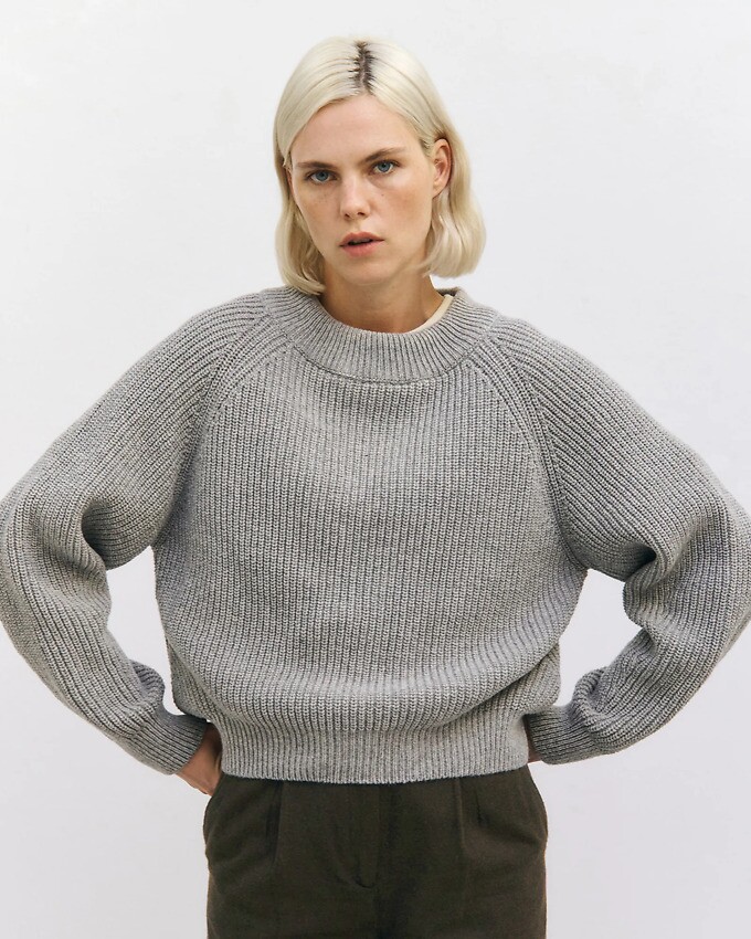Pull en laine épaisse, coupe raccourcie, 100% fil recyclé post-consommation.