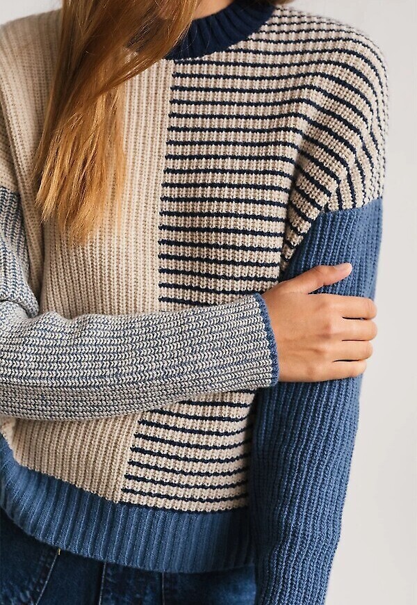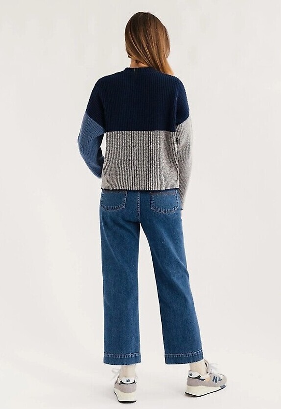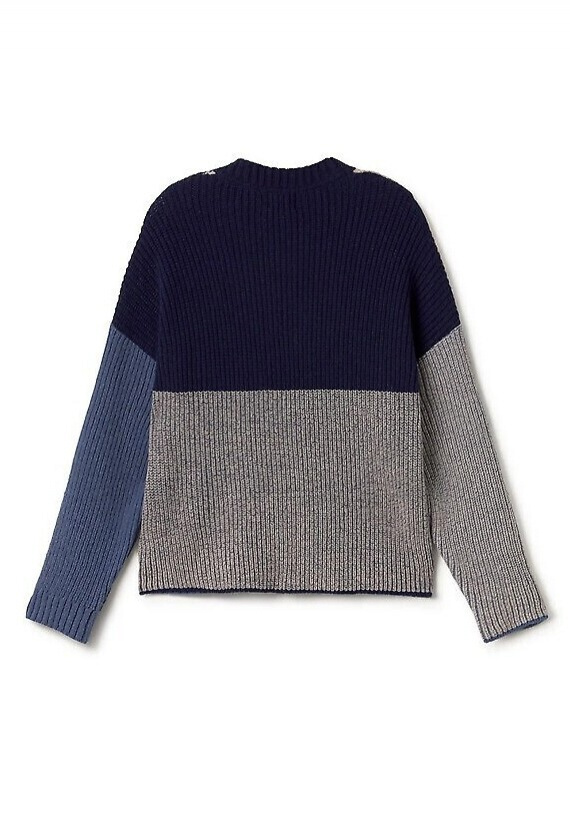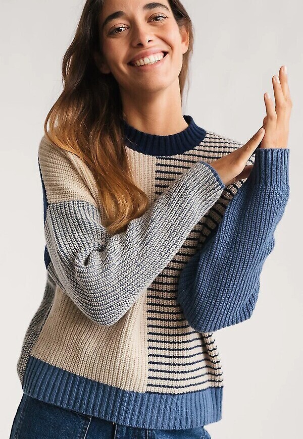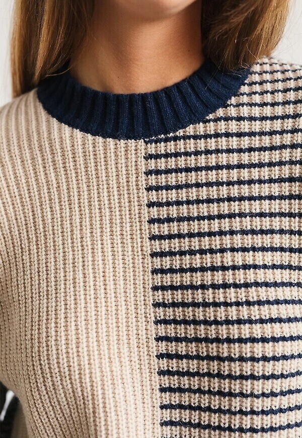 Gemütlicher Wollstrickpullover mit schönen Farbblöcken und kontrastierenden Linien.