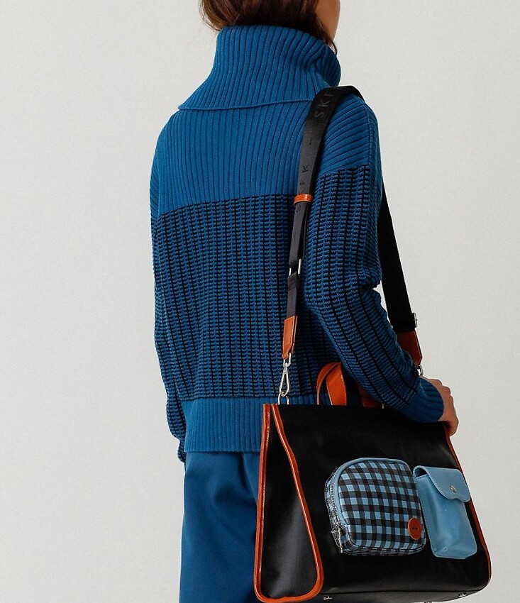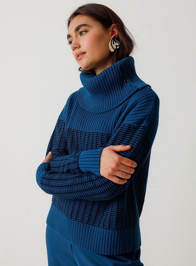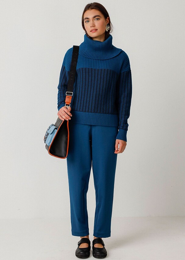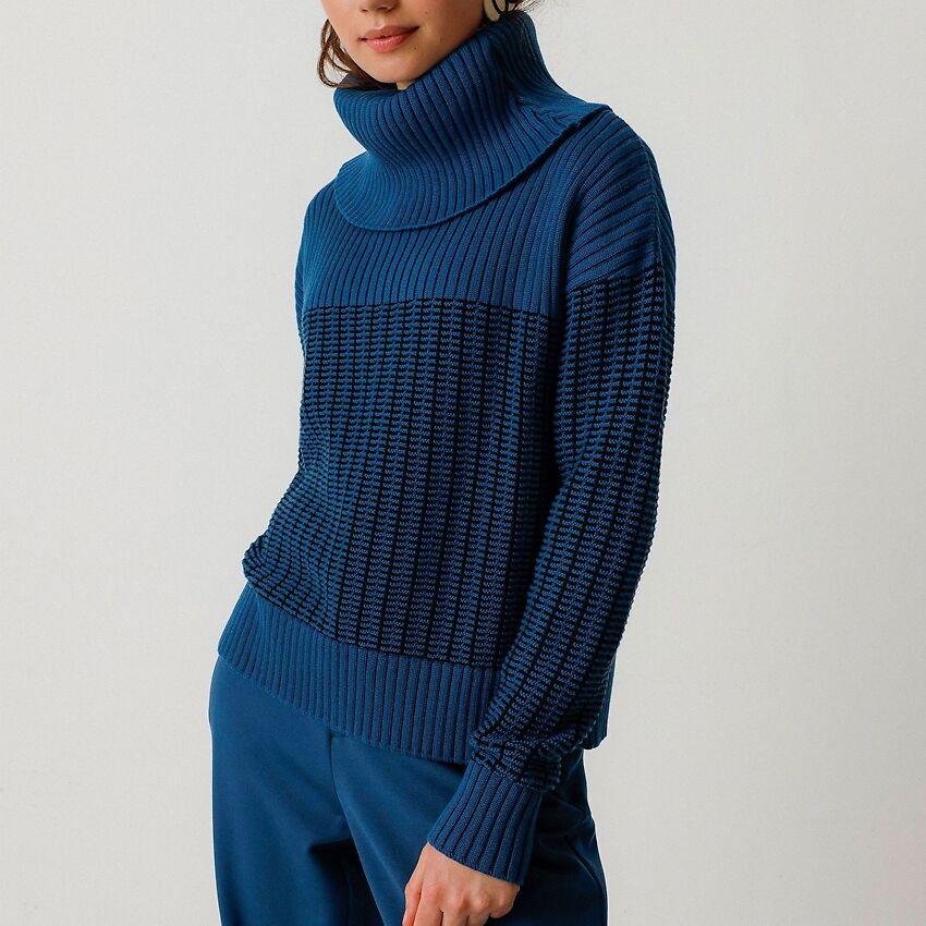 Two-tone knitted sweater with a large turtleneck made from soft organic cotton.