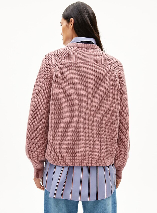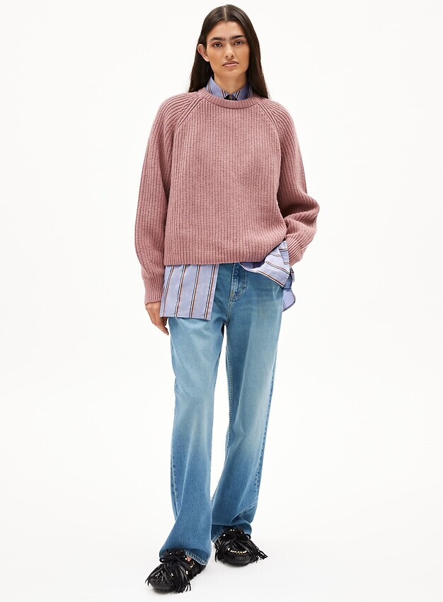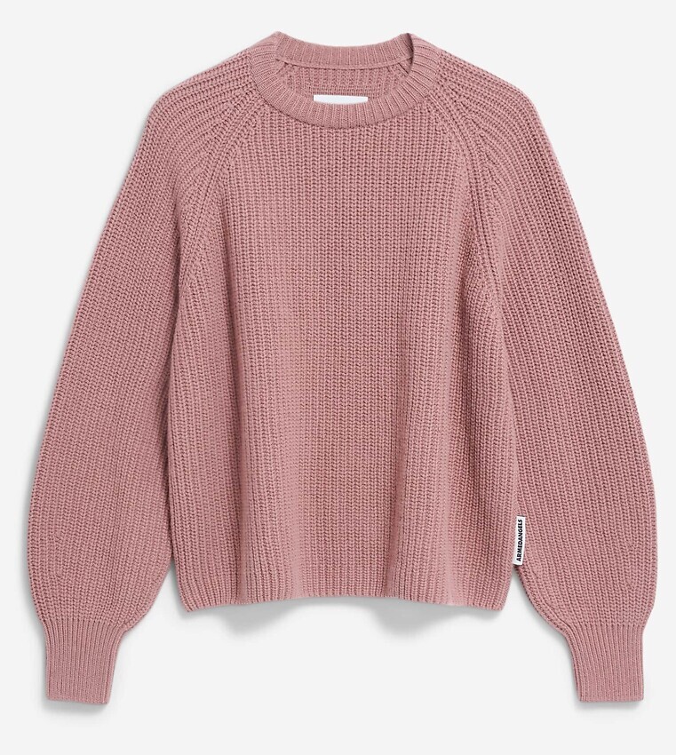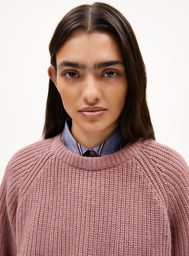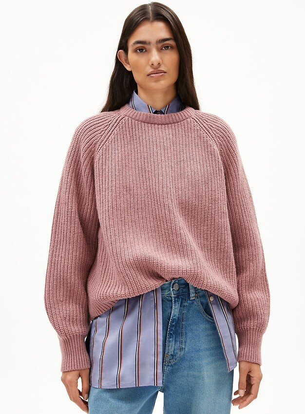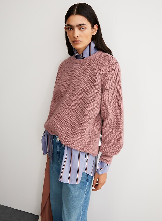 Pull en grosse maille avec une structure côtelée marquante et une coupe large et confortable.