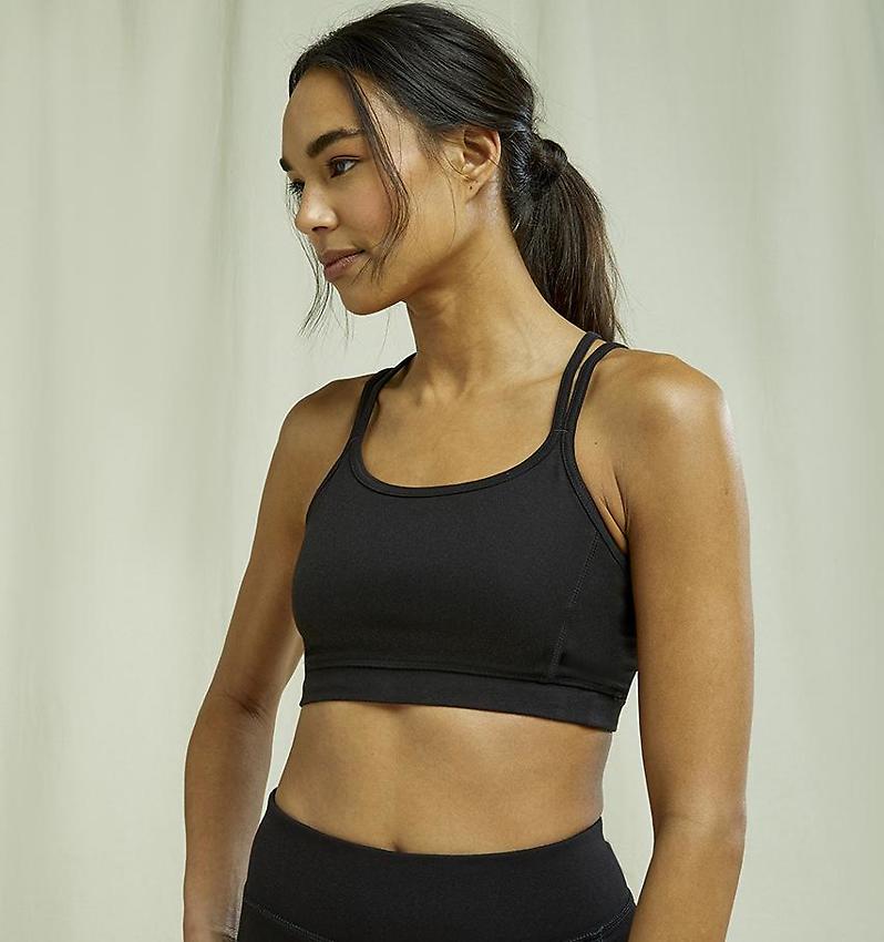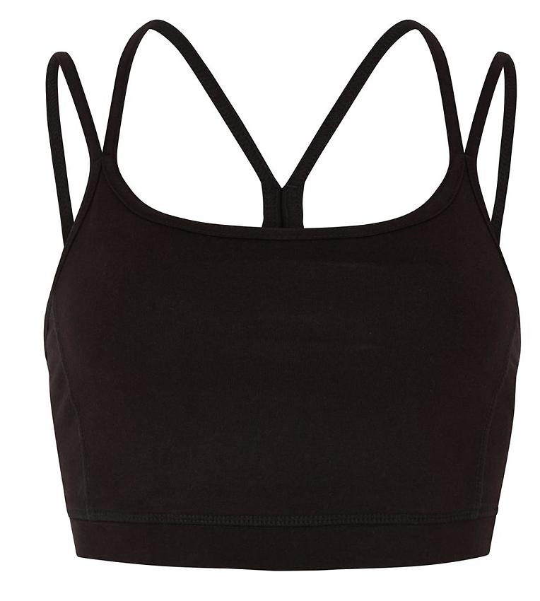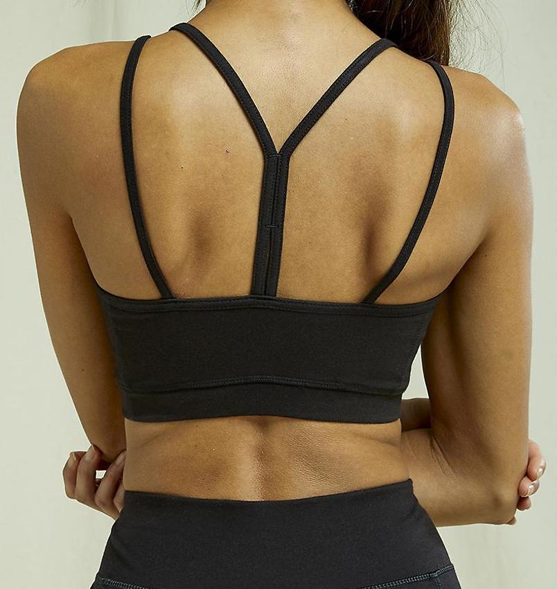 Yoga crop top in black made from 95% GOTS and Fair Trade certified organic cotton and 5% elastane. The fabric composition is supportive and thick, sculpting and supporting your bust as a classic sports bra would. The weight of the fabric makes this piece comfortable and non see-through and the 5% elastane content allows for stretch and movement making it suitable for a wide range of physical activities.