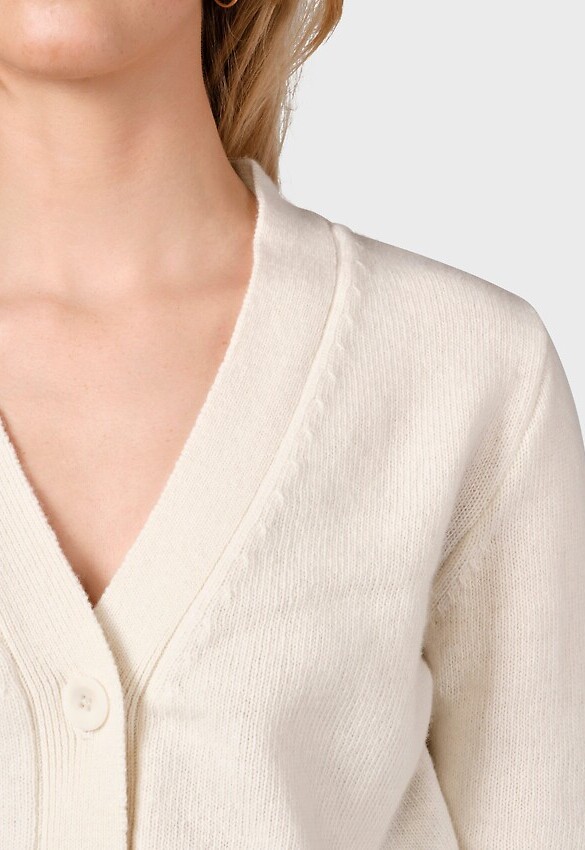 Wilma is a brushed merino wool cardigan with a V-neck, button fastening and wide ribbed cuffs and waistband.
