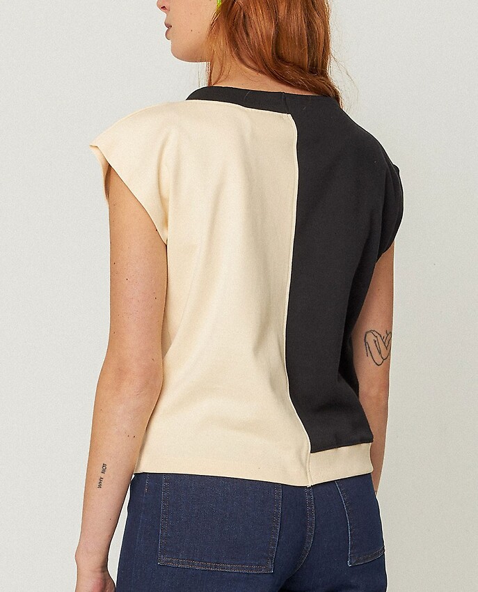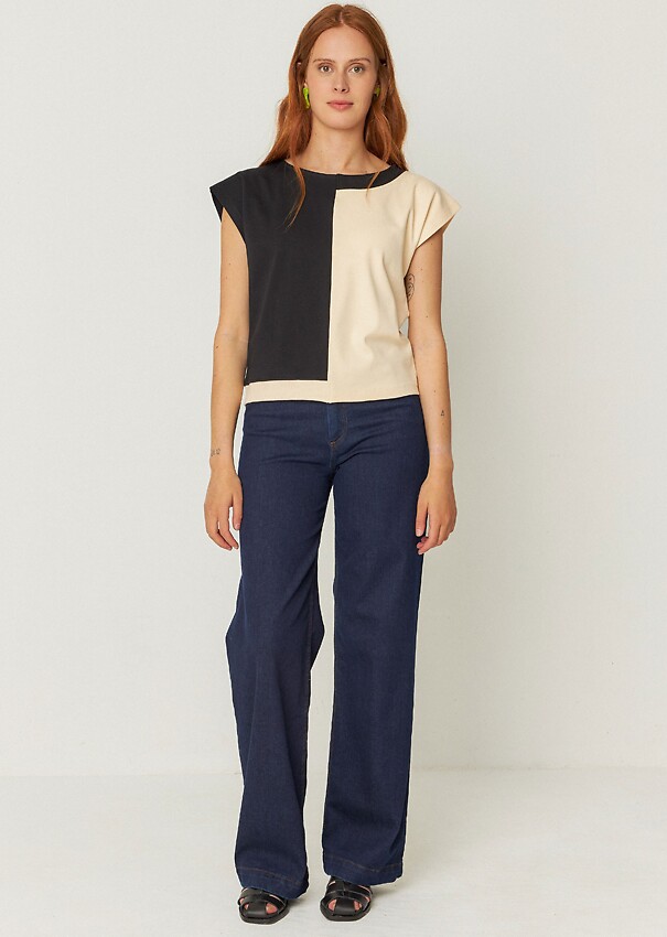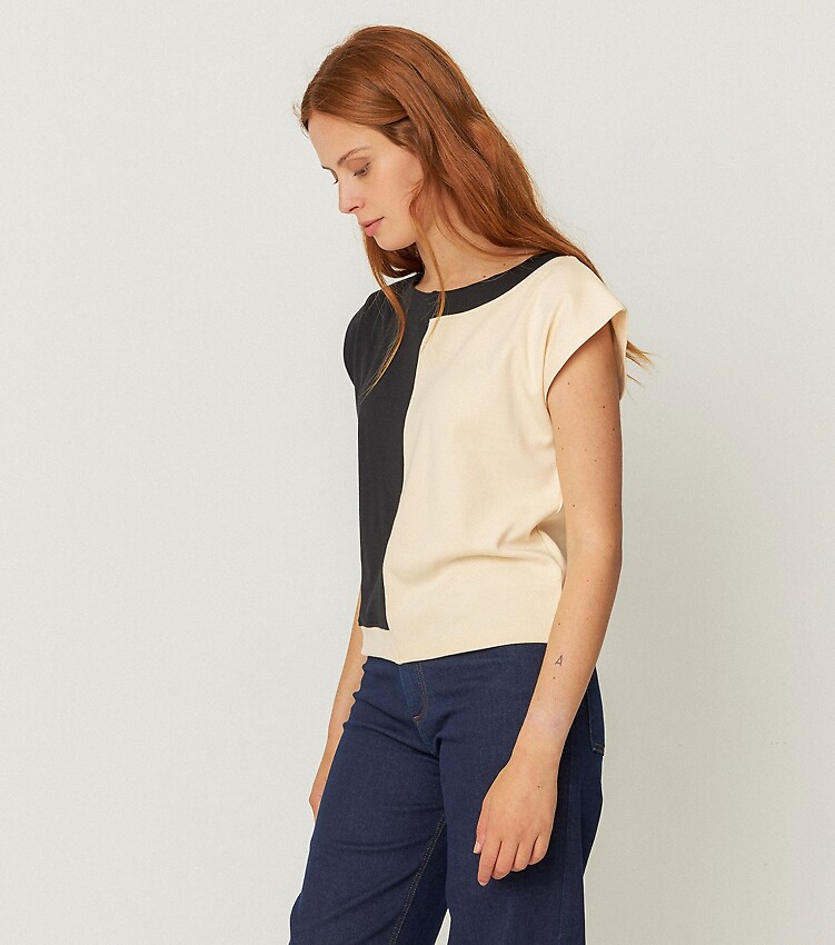 Kurzärmeliges T-Shirt mit etwas weiterem Rundhalsausschnitt.