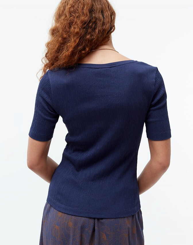 Eng anliegendes Top mit einem weiten Rundhals Ausschnitt aus Biobaumwolle mit einem kleinen Elastan Anteil. Das smocked Jersey ist sehr dehnbar, schmiegt sich schön Deinem Körper an und ist durch kleine Falten und Raffungen verziert.