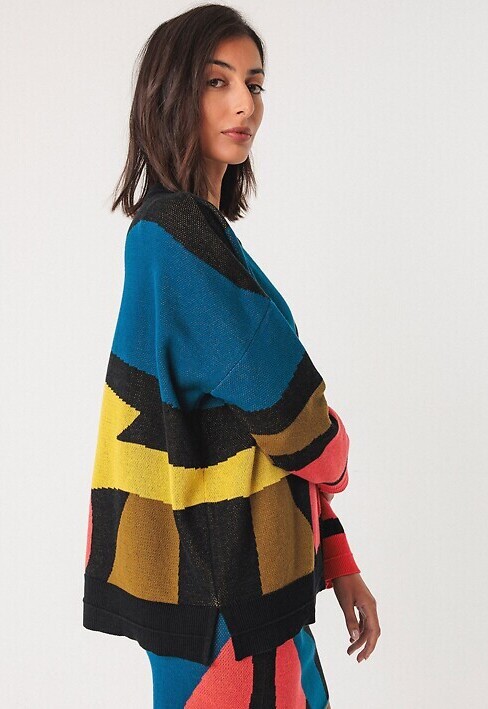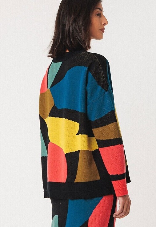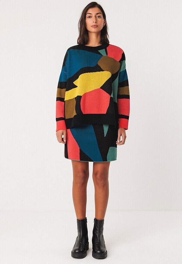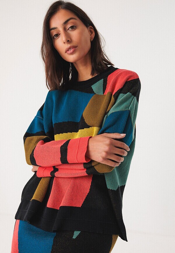 Mittelschwerer Feinstrickpullover mit buntem Jacquardmuster aus weicher Biobaumwolle.