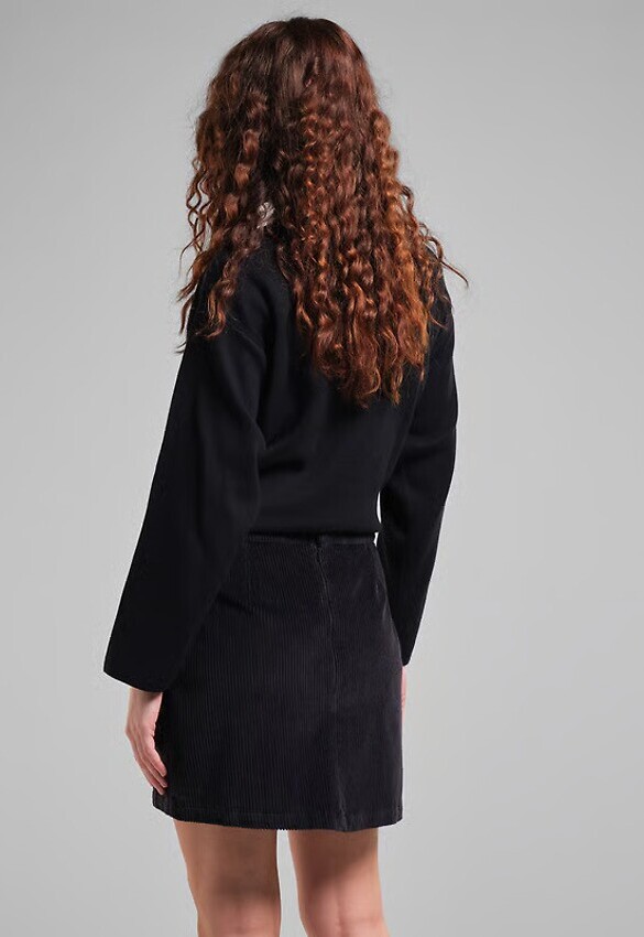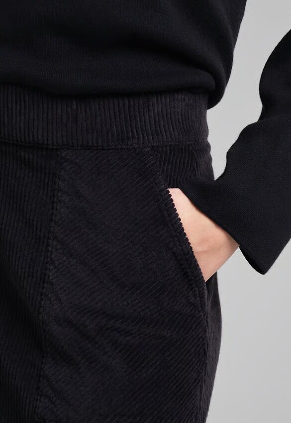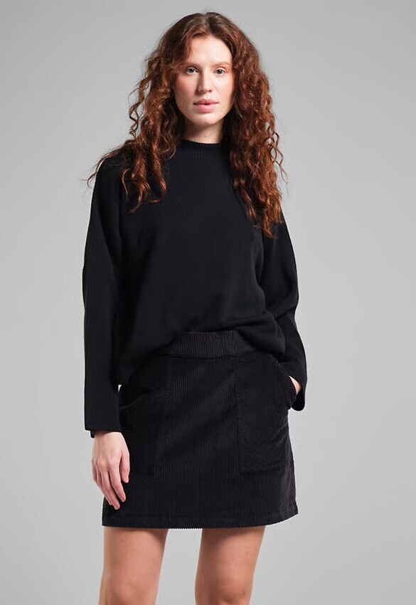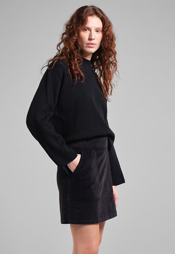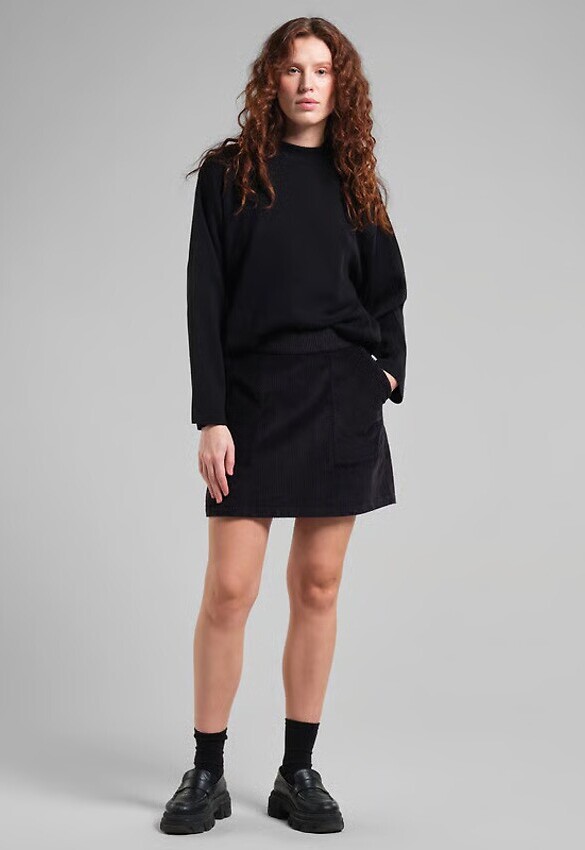 Kurzer A-Linien-Rock aus Bio-Baumwollcord. Normale Passform mit elastischem Bund und unsichtbarem Reißverschluss auf der Rückseite. Zwei große aufgesetzte Taschen vorne.