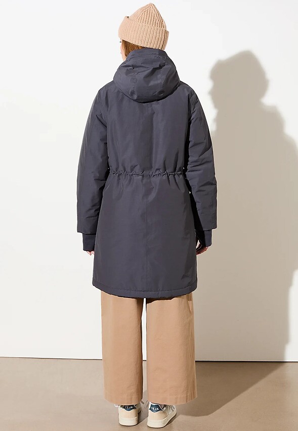 Das Obermaterial ist fest gewebtes Material aus 59% Biobaumwolle und 41% recyceltem Nylon, von innen laminiert mit einer Membran aus Polyurethan. Somit ist die Jacke wind- und wasserdicht und  atmungsaktiv.