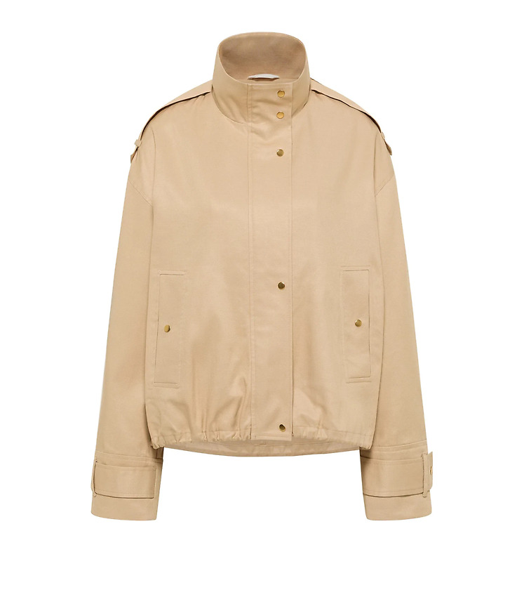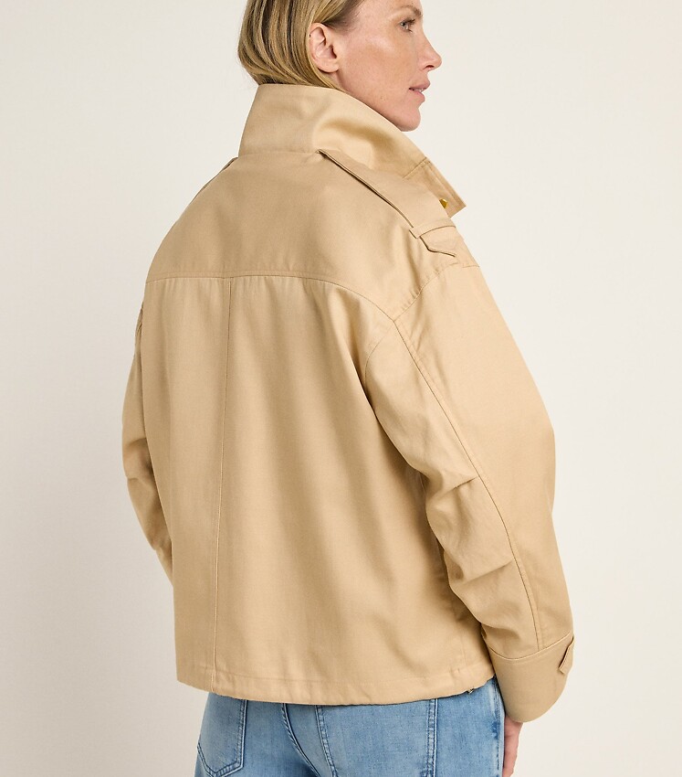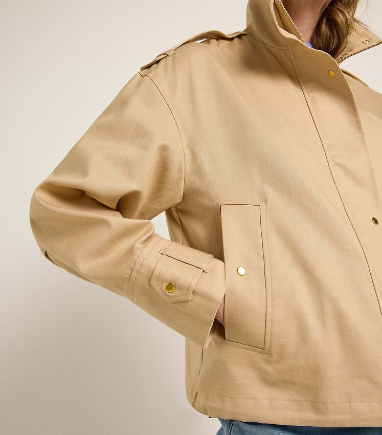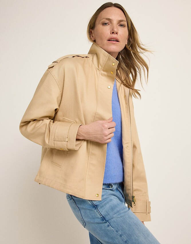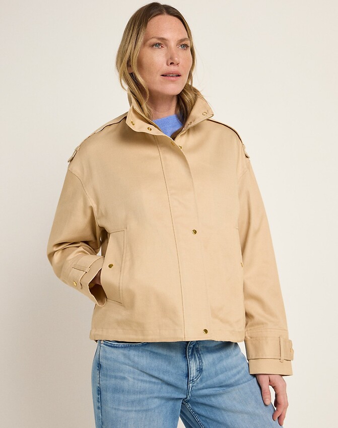 Die Ärmelabschlüsse verleihen der Jacke eine sportlich-elegante Note, während die markante Schulterklappe für einen besonderen Akzent sorgt. Zwei praktische Taschen bieten zusätzlichen Komfort und runden das Design ab. Mit dieser Jacke setzen Sie auf einen lässigen, aber zugleich raffinierten Look, der sich vielseitig kombinieren lässt – ob zu Jeans, Röcken oder Kleider.