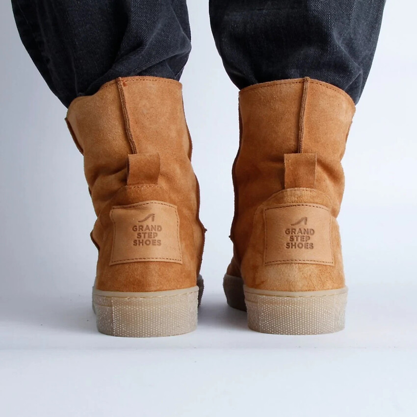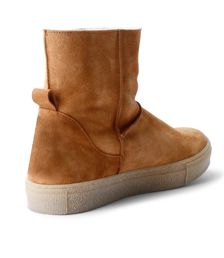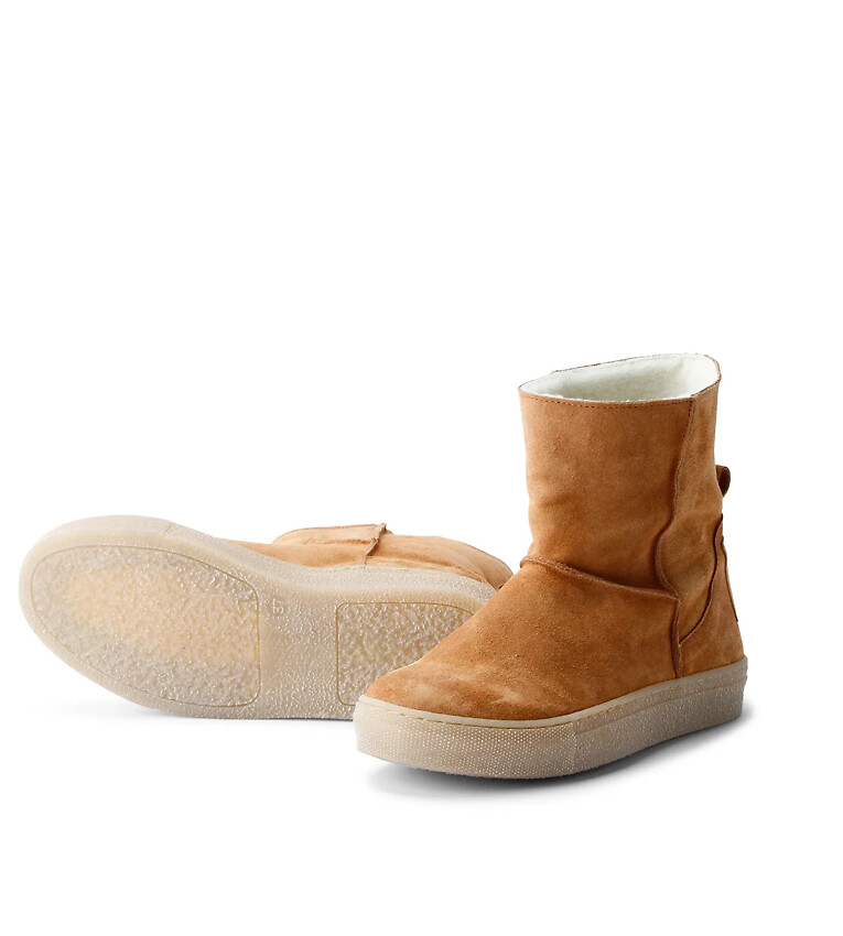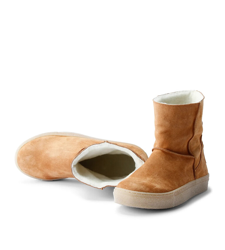 Warm gefütterter Bootie aus weichem, pflanzlich gegerbtem Suede-Leder. Innen mit warmem Wollplüsch gefüttert. Durch die Wolle bleiben die Füße warm ohne zu schwitzen. Wolle wirkt wäremregulierend, antibakteriell und antistatisch.