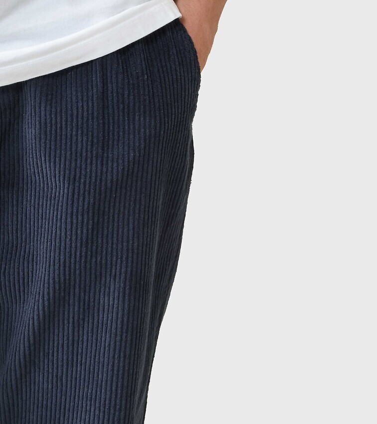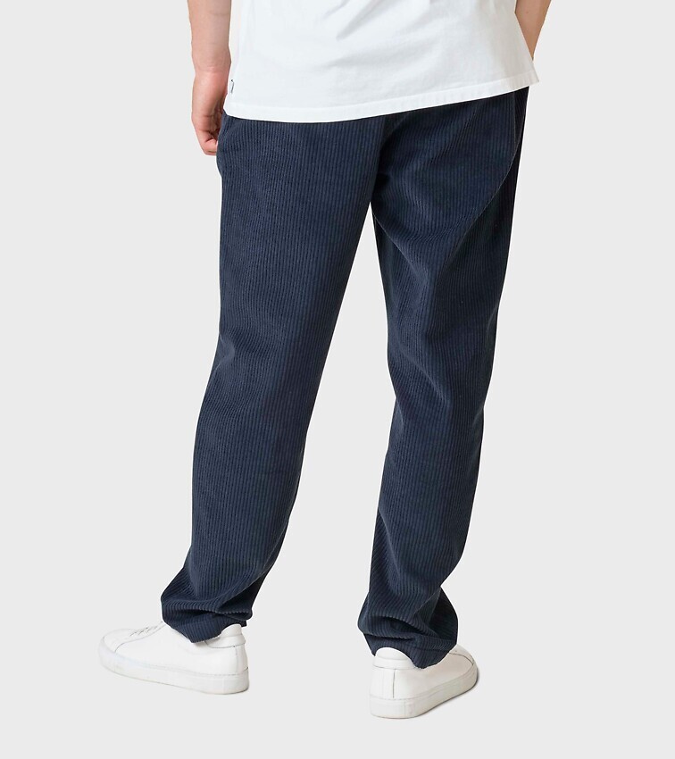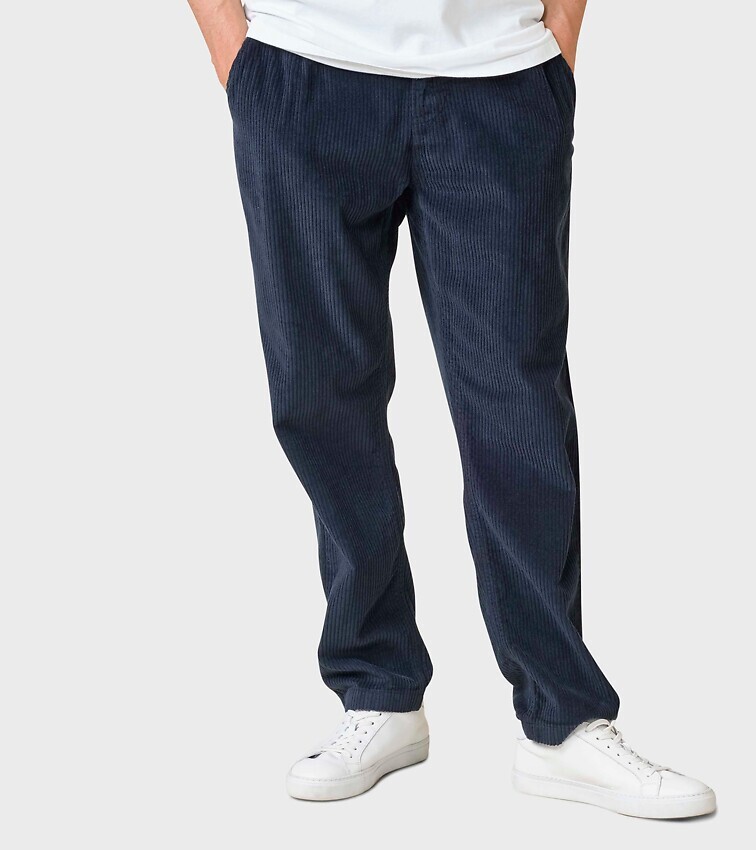 Solid colored corduroy trousers in a slightly tapered cut that narrows along the leg towards the foot. The trousers have a total of four pockets, belt loops, a button fastening and subtle creases as a detail on the front.