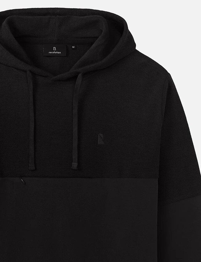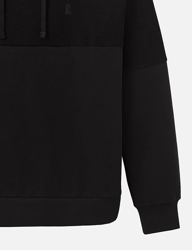 The upper part of the hoodie is made from terry-like fabric, while the lower part is made from sweat fabric.