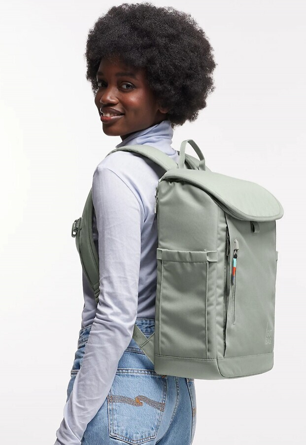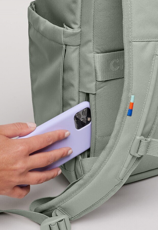 - RE:PET Hauptmaterial aus recyceltem Ocean Impact Plastic, Innenmaterial aus recyceltem PET, Polsterung aus PE und recyceltem Polyester, Webbänder aus recyceltem PA, Reißverschlüsse aus recyceltem Nylon, Mesh aus recyceltem PET, elastisches Einfassband innen PET/Latex, Klettverschluss innen aus Polyester