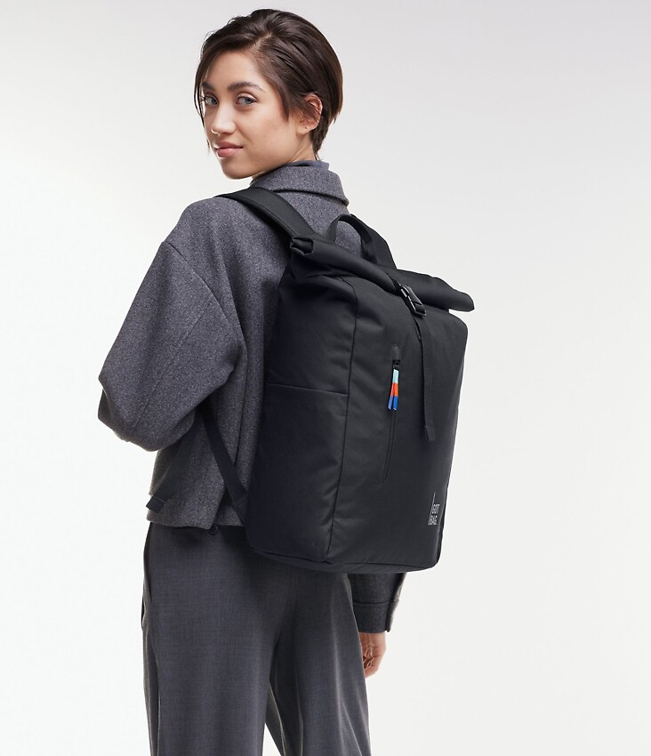 Effortlessly easy: The lightweight version of the classic, made from soft, water-repellent material with a zippered roll-top and outer bottle pockets.