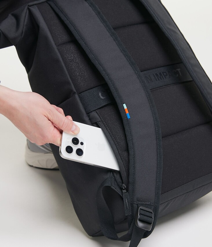 Main fabric made of recycled Ocean Impact Plastic, lining recycled PET, padding PU, buckles POM, webbings recycled PET, outer zipper recycled nylon, inner zipper PA, velcro PA, mesh recycled PET