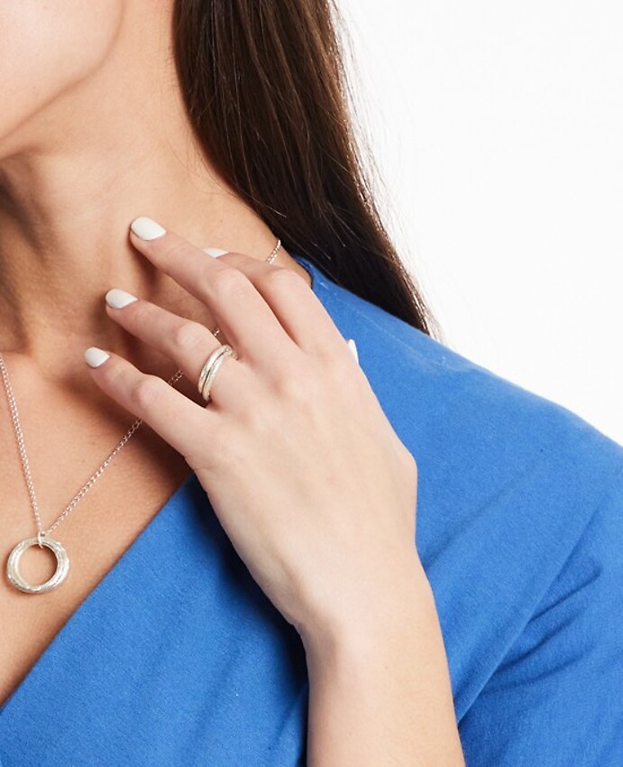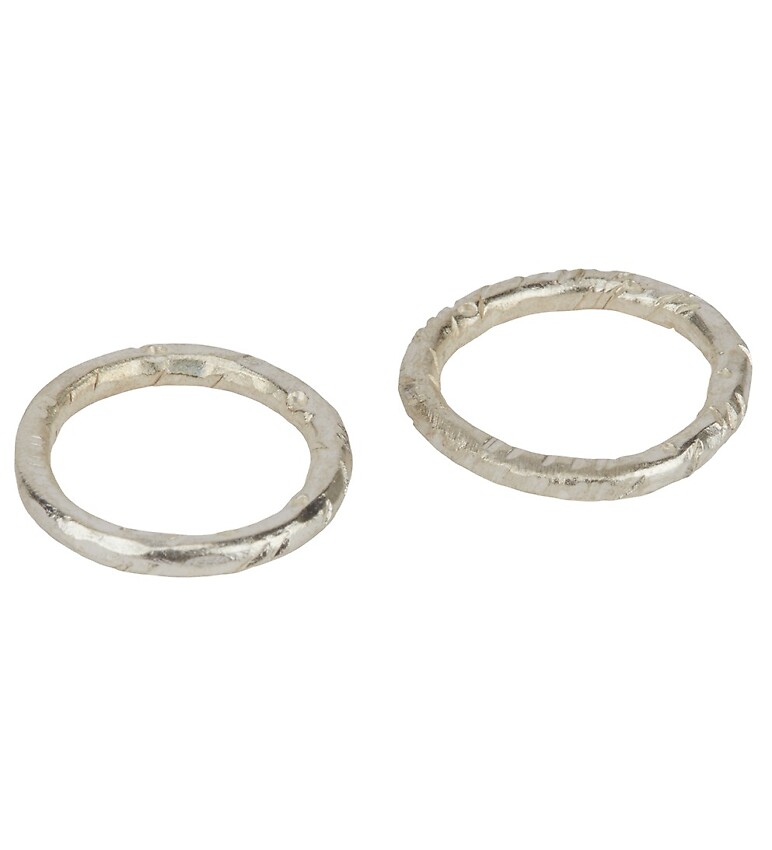 Ein Set aus zwei zarten, versilberten Ringen in zwei verschiedenen Größen. Diese handgefertigten Ringe können einzeln oder als Paar übereinander getragen werden.