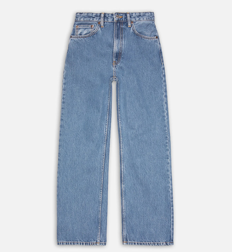 Jeans in lockerer Passform mit weitem Bein und hoher Taille in einer mittelblauen Stonewash-Waschung. Hergestellt aus Bio-Baumwolle. Festes, schweres Denim!