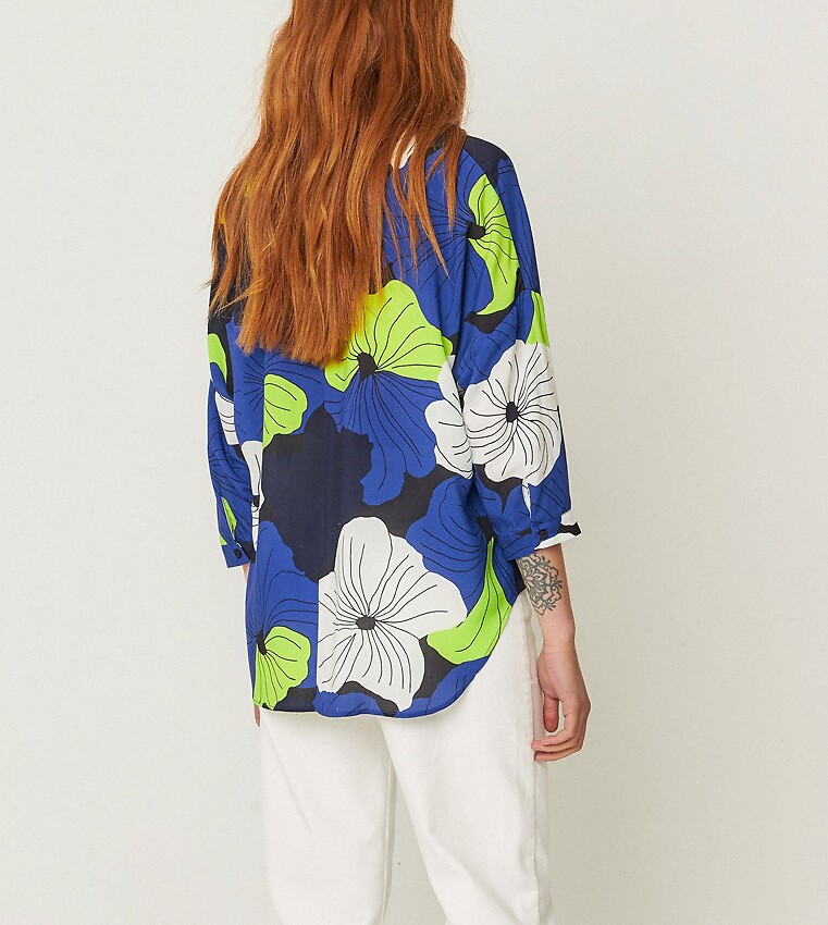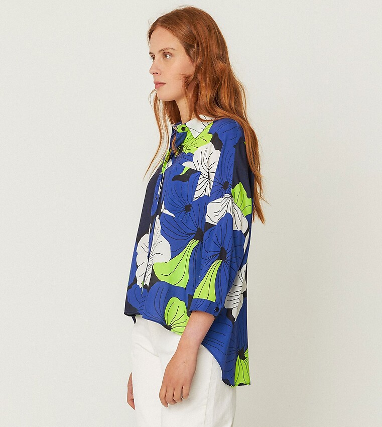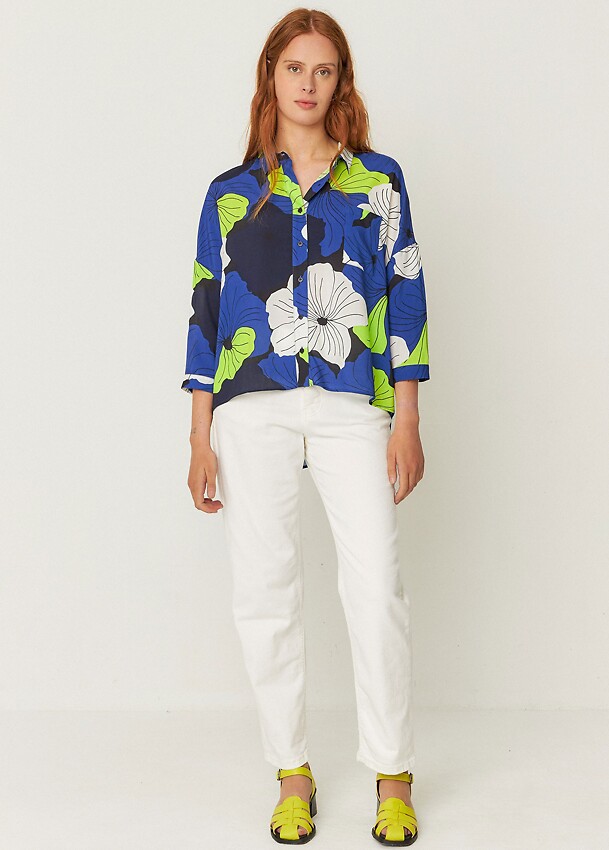 Shirt with rounded hem and 3/4-length sleeves. Classic collar and front button closure.