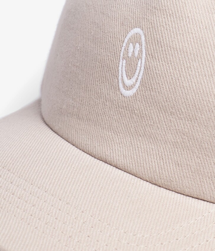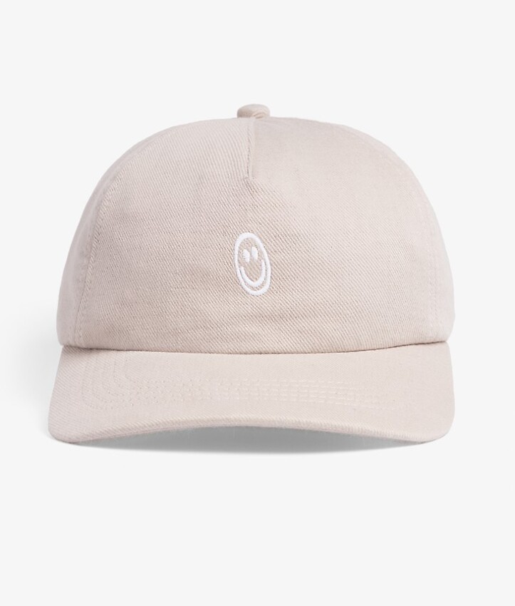 Floppy Cap aus einem leichten Biobaumwoll-Stoff in Leinen-Optik. Mit Smiley-Stick auf der Vorderseite. Die Größe ist durch einen Riemen auf der Rückseite individuell einstellbar.