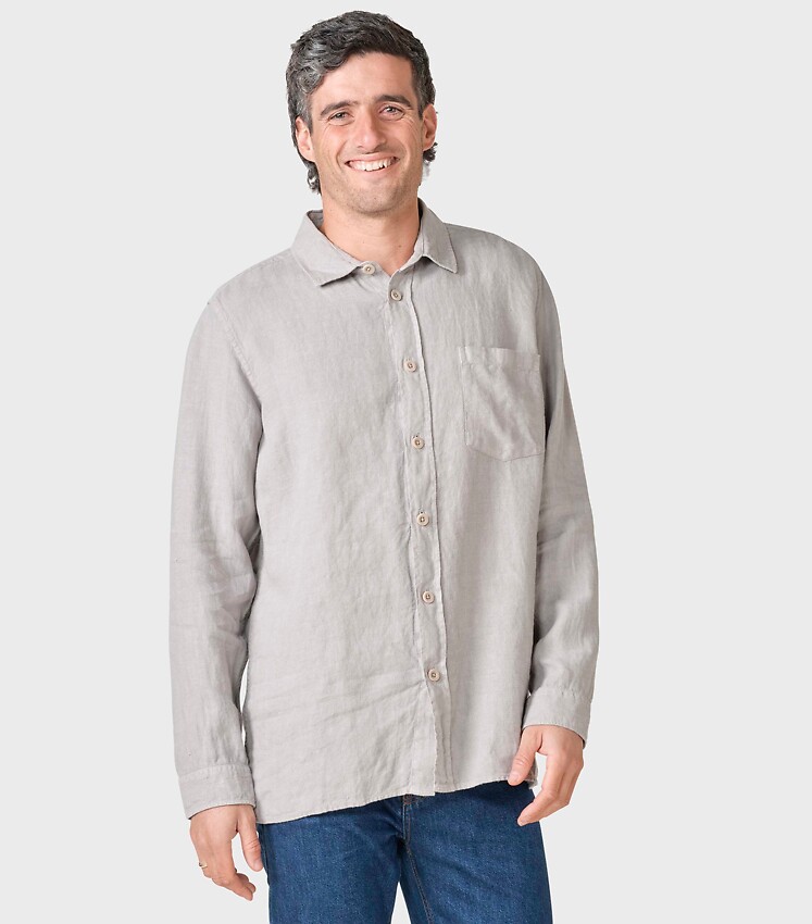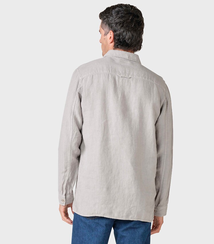 Langärmliges Leinen-Hemd mit etwas größeren Knöpfen, Kragen sowie einer dezenten Tasche auf der linken Brust als Detail. Der Schnitt ist gerade und etwas weiter, und wir empfehlen, das Hemd in deiner normalerweise bevorzugten Größe zu wählen.