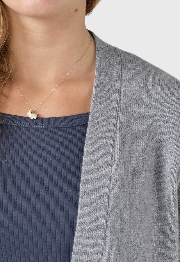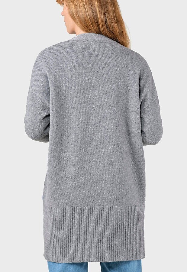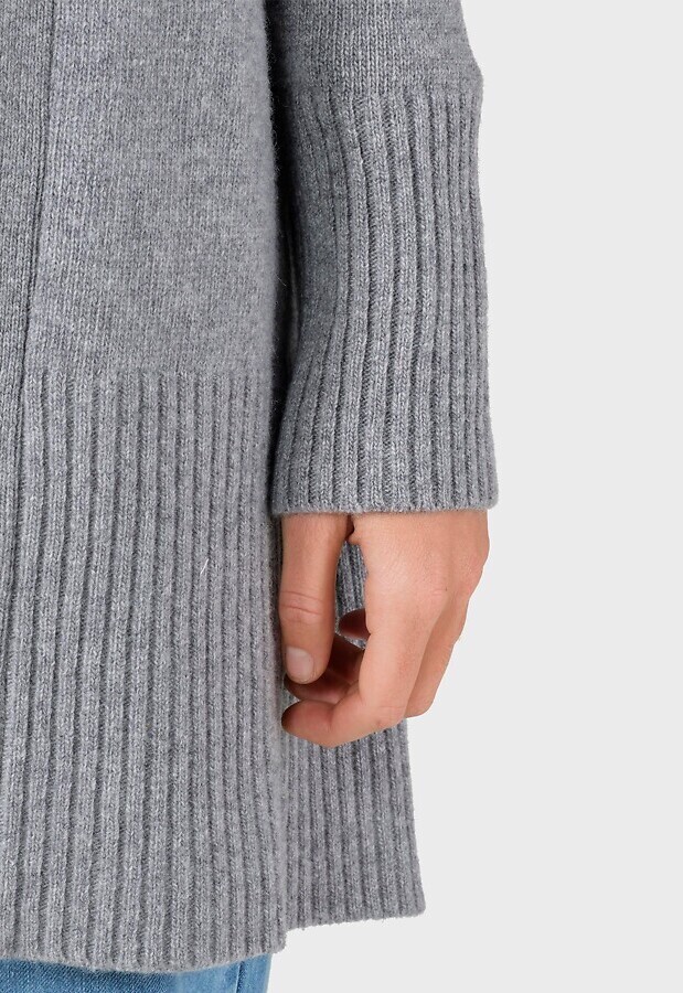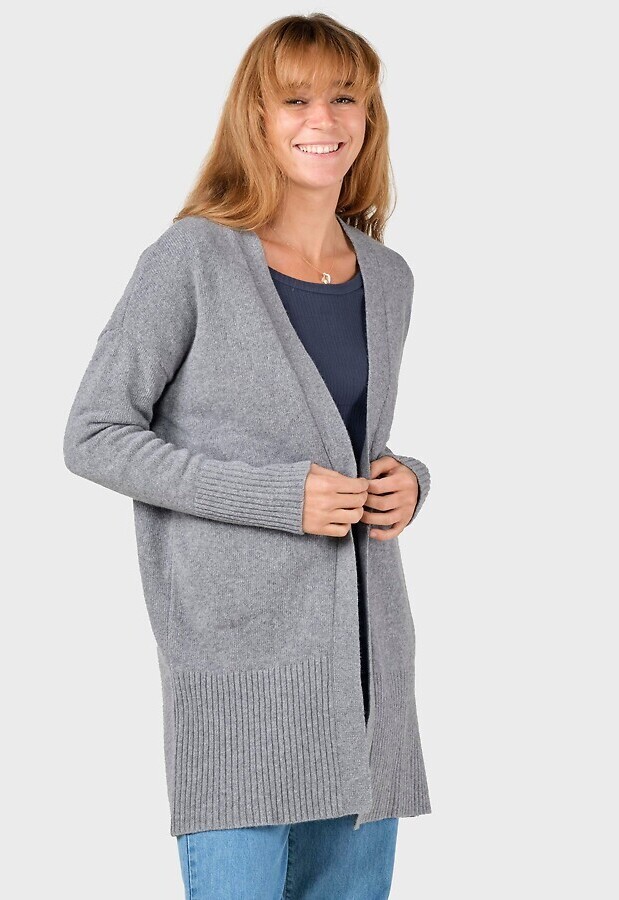 Lange, mitteldicke Strickjacke aus gebürsteter Merinowolle mit überschnittenen Schultern und extra hohen, femininen Rippbündchen und Saum.
