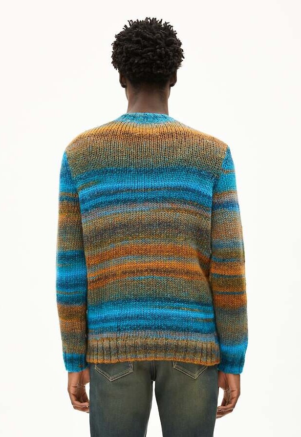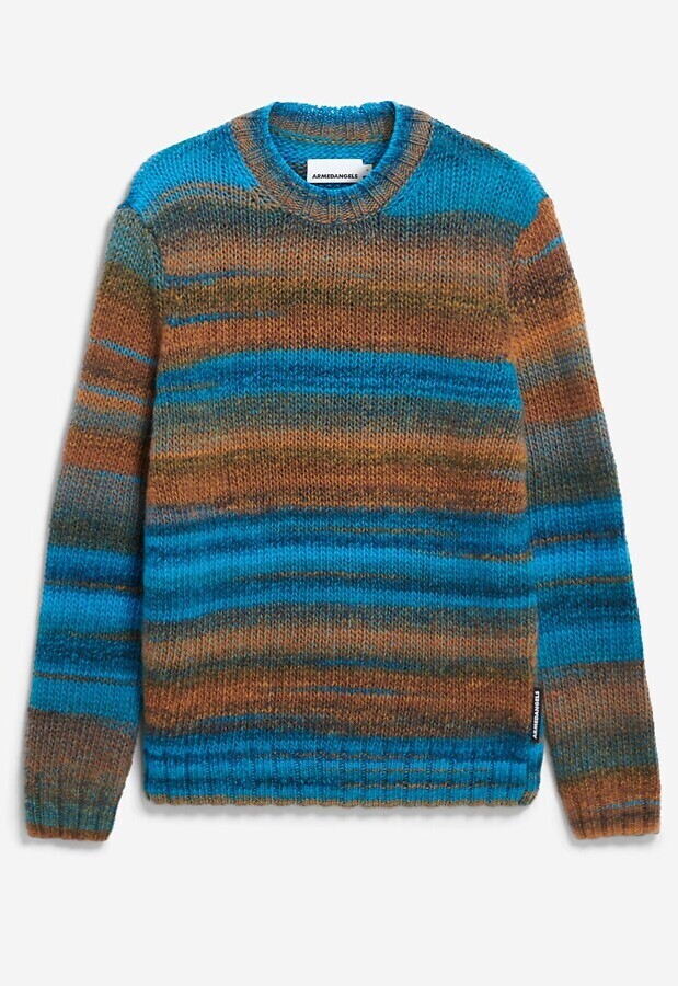 Wool knit sweater with a striking striped pattern.