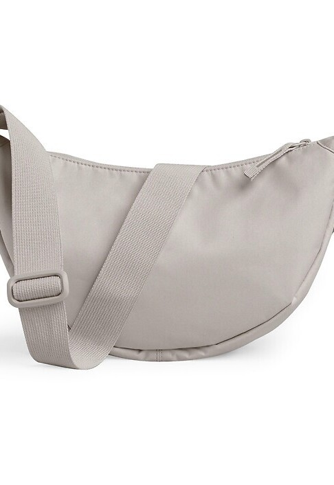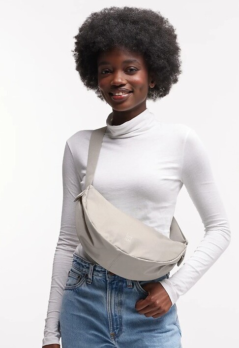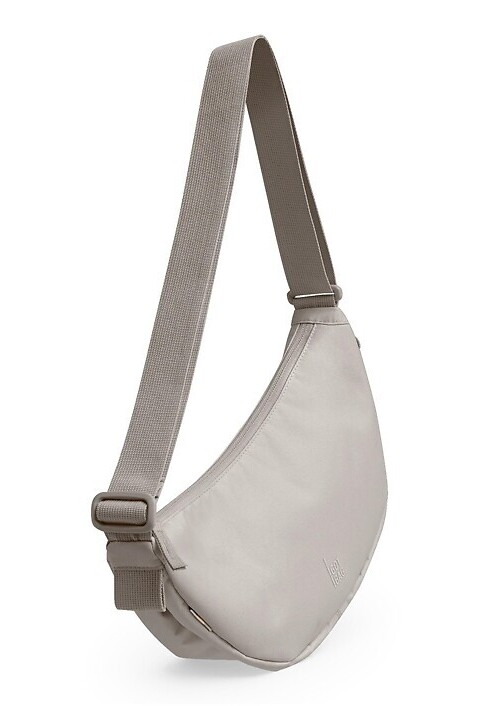 Wasserfeste Tasche mit verstellbarem Schulterriemen, runder Form und weichem Material.