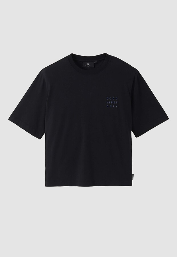T-Shirt im lässigen Loose Fit mit kleinem Brustprint und auffälligem Blumenmotiv auf der Rückseite.