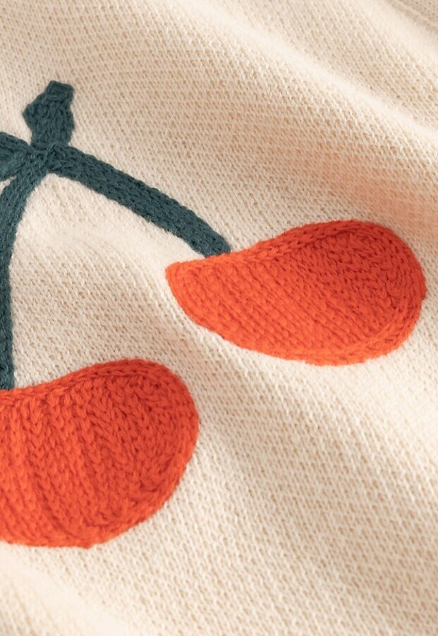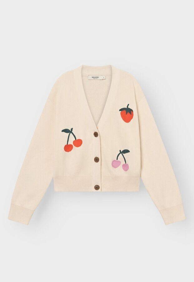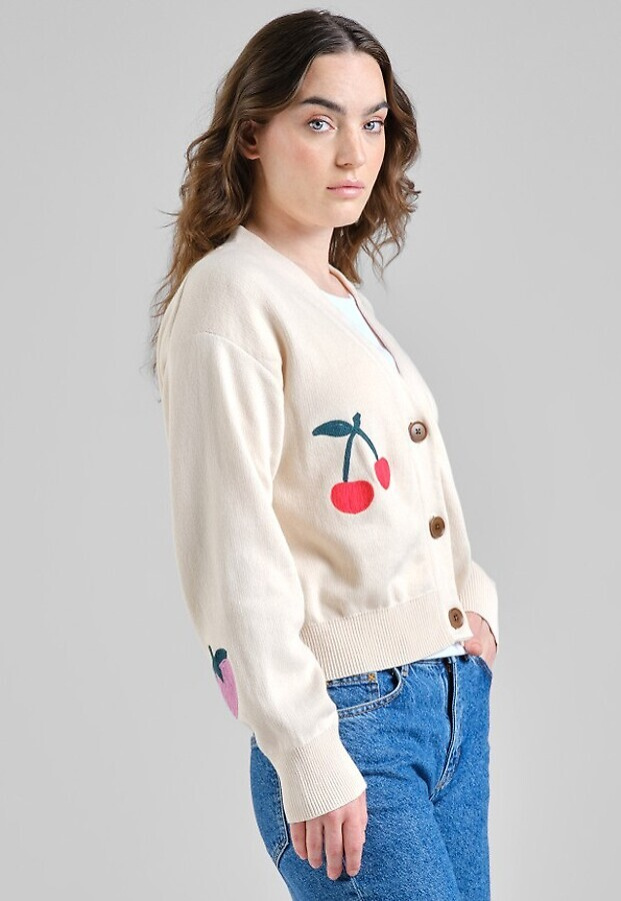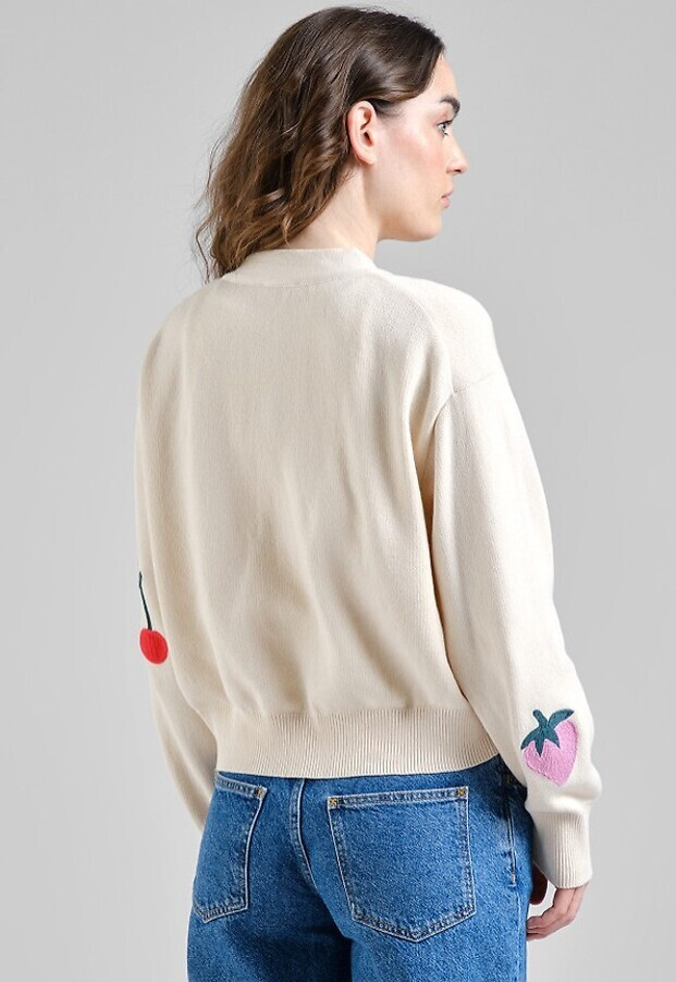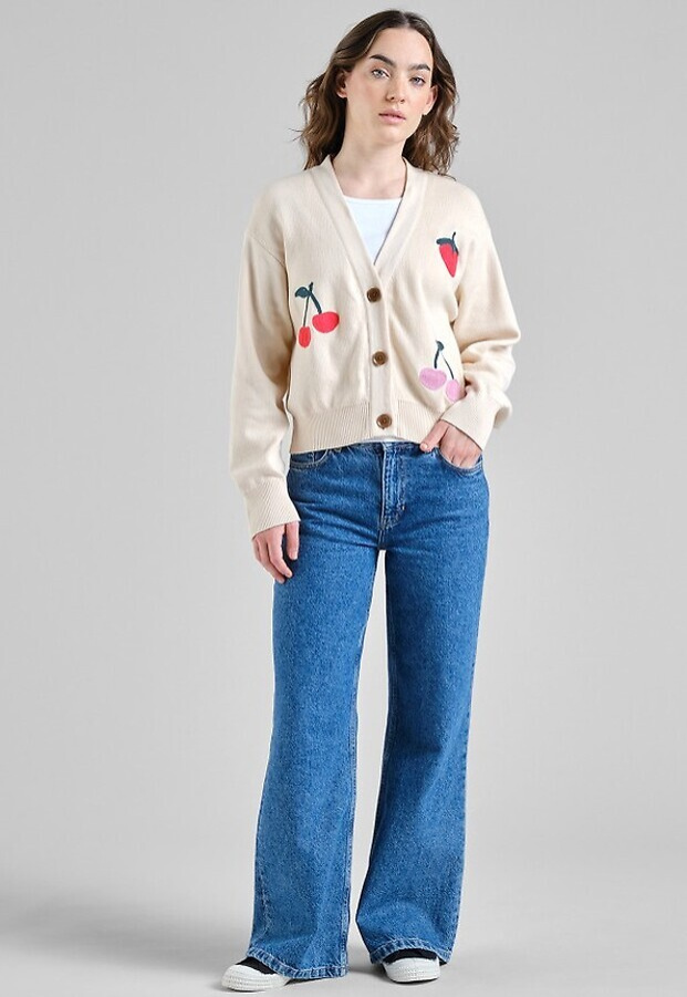 Lässige Jacquard-Strickjacke mit leicht verkürzter Silhouette und tiefem V-Ausschnitt. Cardigan in Vanilleweiß mit Jacquard‑Beerenmotiv, locker geschnitten und leicht verkürzt. Der tiefe V‑Ausschnitt und große Corozo‑Knöpfe treffen auf voluminöse lange Ärmel; Rippbündchen und -saum rahmen die Silhouette. Der Relaxed Fit fällt locker und endet etwa auf Taillenhöhe – ideal zum Layern. Gestrickt aus GOTS‑zertifizierter Bio‑Baumwolle – weich im Griff und nach anerkannten Standards geprüft.