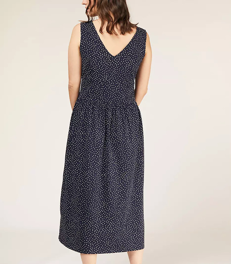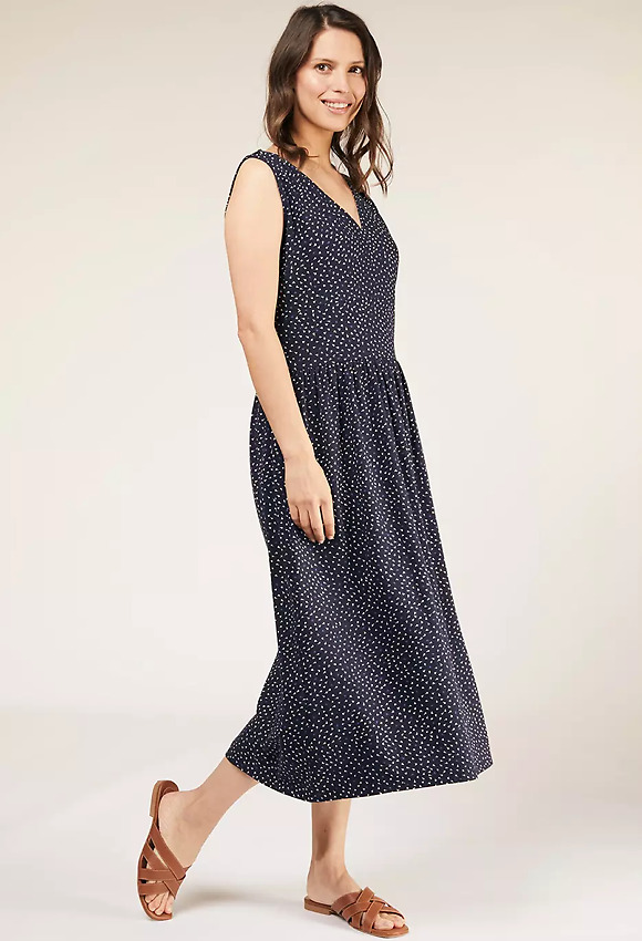 Hübsches, locker sitzendes Midikleid aus Bio-Baumwolljersey. Mit V-Ausschnitt vorne und hinten und leicht gerafften Schultern für perfekten Faltenwurf.