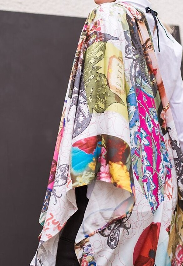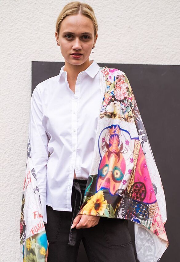 Der Schal hat eine großzügige Breite, sodass du ihn als Tuch oder auch als Stola tragen kannst. Passt super zur weissen Bluse und aufgrund der Farbvielfalt auch zu vielen anderen Styles.