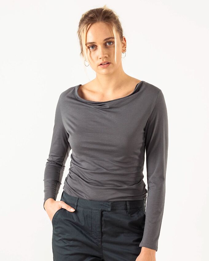 Nice jersey longsleeve with cascade neck, made from soft organic cotton jersey.