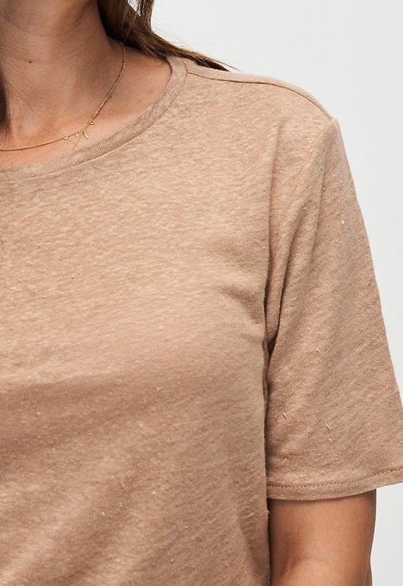 Leinen-T-Shirt für Damen, bestehend aus einer Mischung aus Biobaumwolle und Leinen. Durch den atmungsaktiven Leinenstoff perfekt für heiße Sommertage.