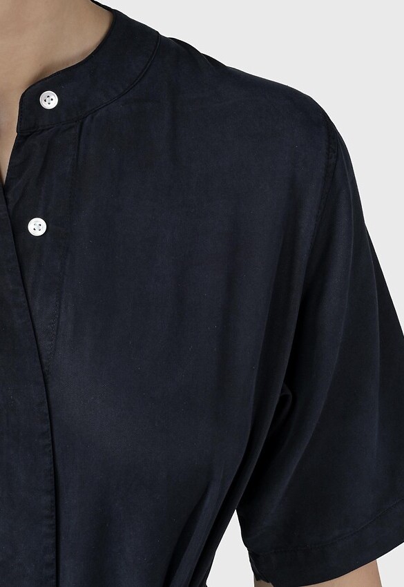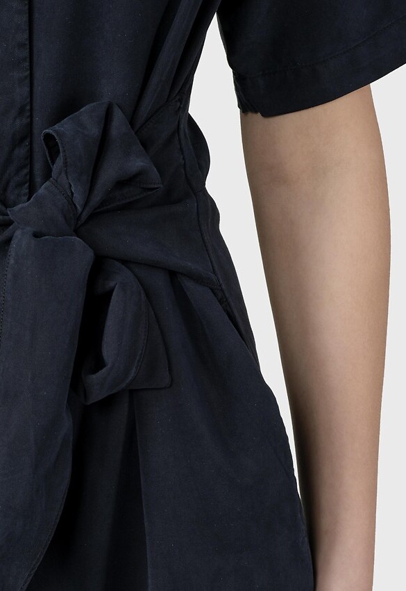 Kurzärmliger Hosenanzug mit dezentem Stehkragen, langen, weit geschnittenen Beinen, zwei Seitentaschen, verdecktem Knopfverschluss und einem breiten Bindeband um die Taille.