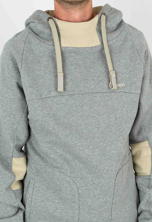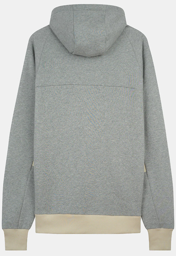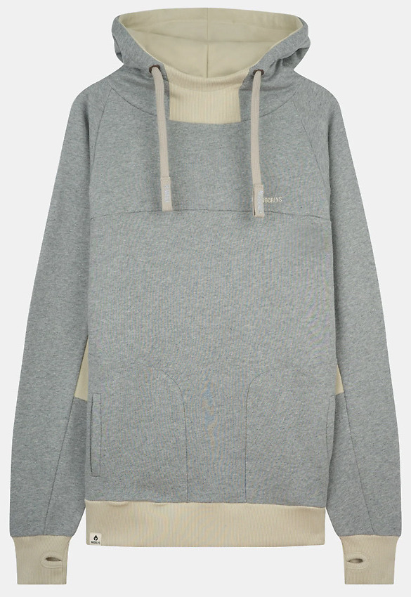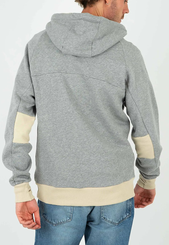 Hoodie in grau mit hellen Einsätzen aus superweicher Biobaumwolle mit 30% recyceltem Polyester für längere Haltbarkeit.
