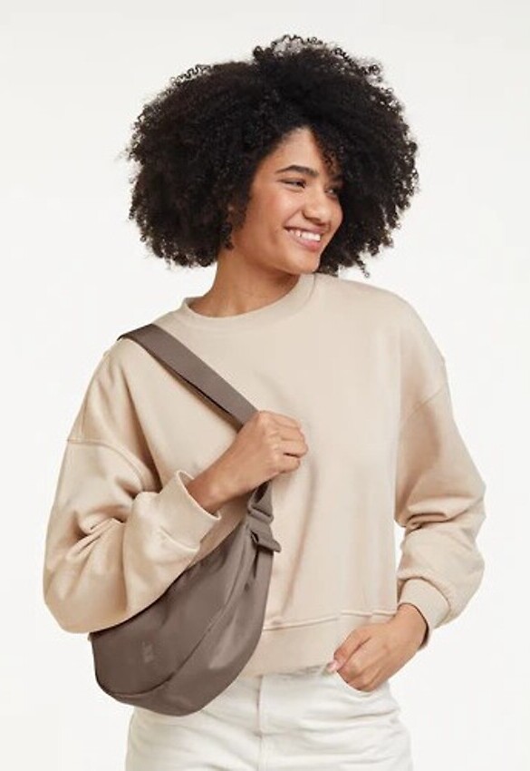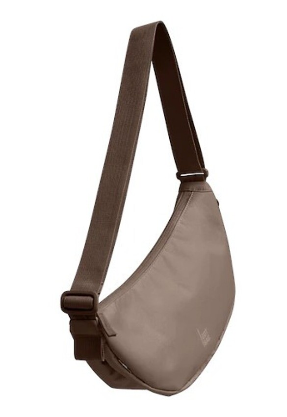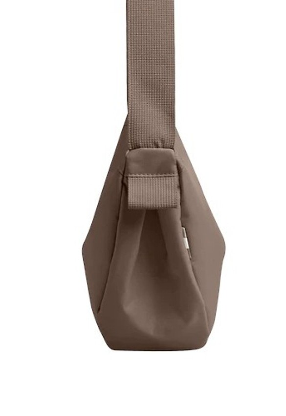 Waterproof bag with adjustable shoulder strap, round shape and soft material.